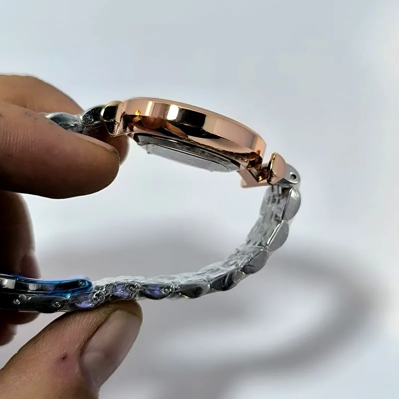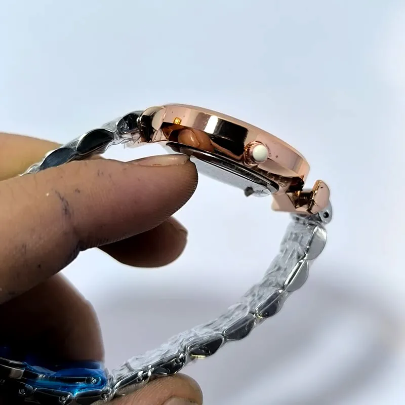 نگین های به کار رفته در این ساعت محکم سر جای خود فیکس شده اند و امکان ریختن آن ها در استفاده های روزمره به هیچ عنوان وجود ندارد، این نگین ها با ایجاد ظاهری درخشان در کنار صفحه ای مواج و سفید حس خاص بودن بیشتری را به مچ دست و استایل شما اضافه می کند .