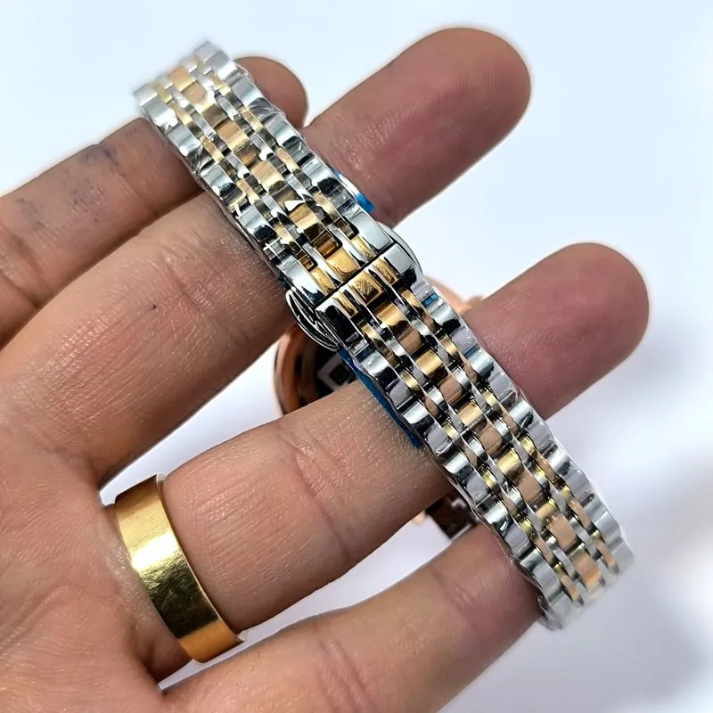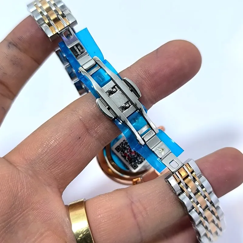 این ساعت زیبا با بند با کیفیت، صفحه خوش رنگ با بازتاب جذاب و رنگ ثابت، شیشه ضد خش و ظاهری بسیار زیبا مناسب مچ دست خانم های ظریف پسند است، این ساعت شیک و مجلسی می تواند جلوه خاصی به دستان شما بدهد و صفحه آن زیر نور رنگ جالبی به خود میگیرد که بسیار زیبا و چشم نواز است .