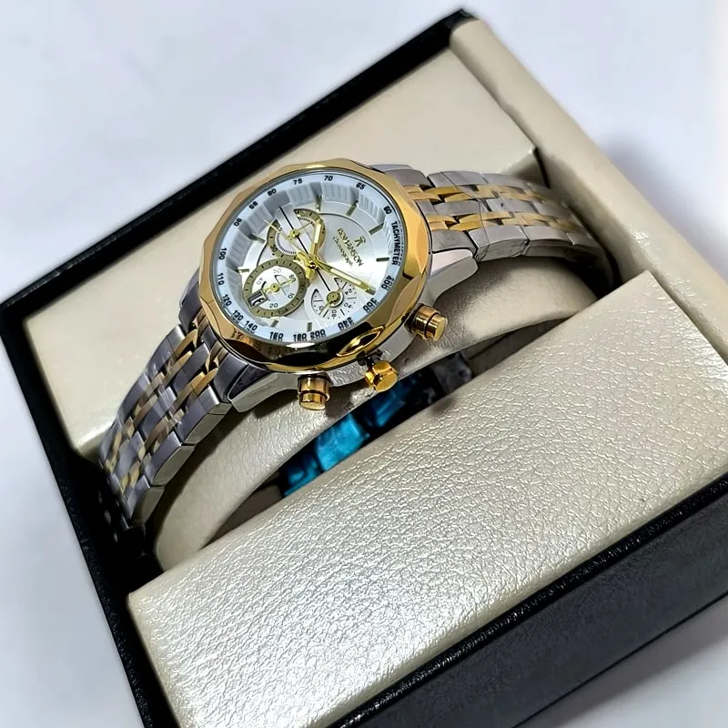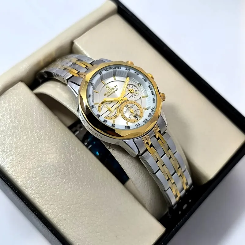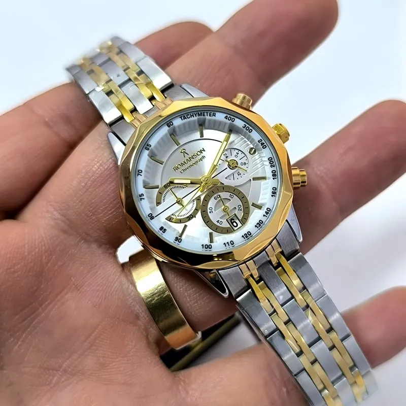 این مدل از رومانسون کرنوگراف (سه موتور فعال) با رنگ ثابت، بند استیل ضد حساسیت با دوام، شیشه معدنی ضد خش و تاریخ دار با قیمتی استثنایی می تواند تکمیل کننده ی استایل شما از لحاظ ساعت دستتان باشد .